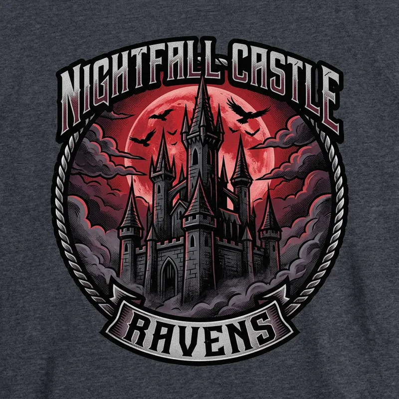 Visualize a scene featuring a dark, ominous castle with tall, jagged towers reaching out to the haunted sky. Lingering around it is an eerie atmosphere dense with foreboding and mystery. Dominating the backdrop is a blood-red moon, large and looming, coloring the sky with hues of crimson and sanguine. This visual composition takes echoes the aesthetics of a traditional sports team mascot logo, with strong, memorable elements that would make it stand out in a crowd.