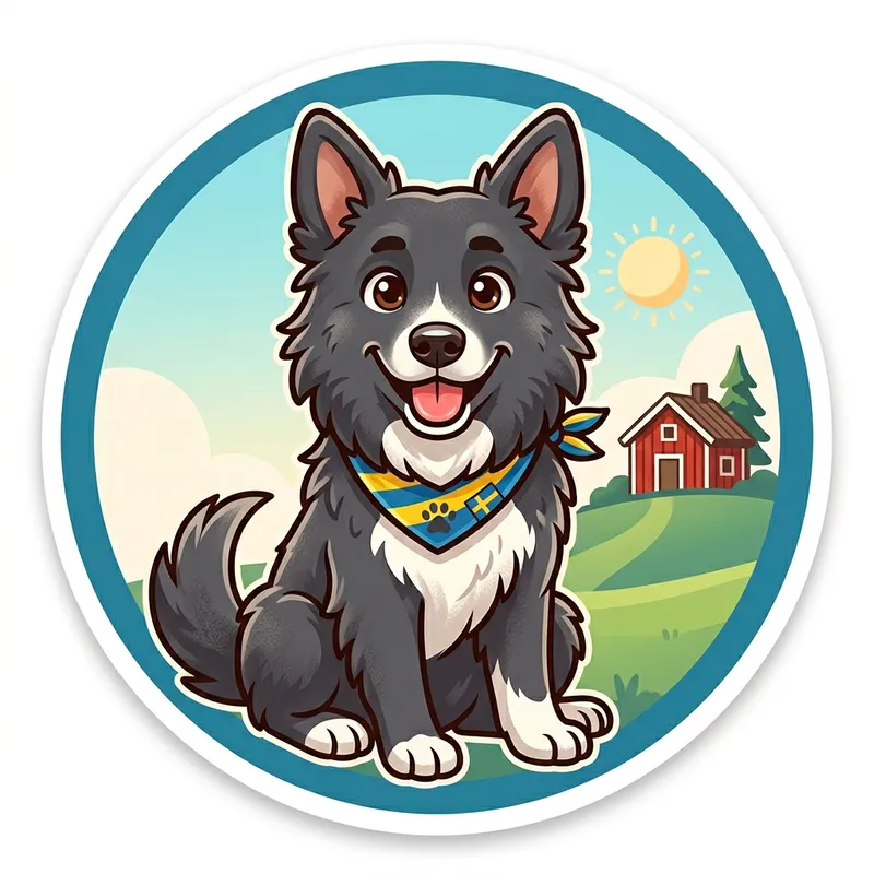 A dark grey Swedish Shepherd dog, illustrated in a playful and engaging cartoon style. The image is designed to serve as an eye-catching and memorable Instagram logo. The dog's helpful and friendly nature is reflected in its expressive eyes and relaxed posture. The background is simple, enhancing the visual impact of the dog figure, making it suitable for digital platforms like Instagram. The overall tone of the logo conveys a blend of fun, loyalty, and a warm community spirit which is inviting to social media users.