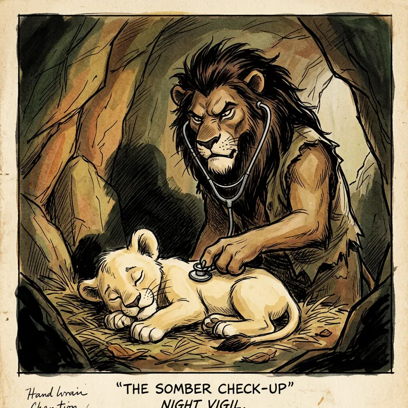 Dark-Maned Lion Doctor Examining Cub's Heartbeat in Sketch Style