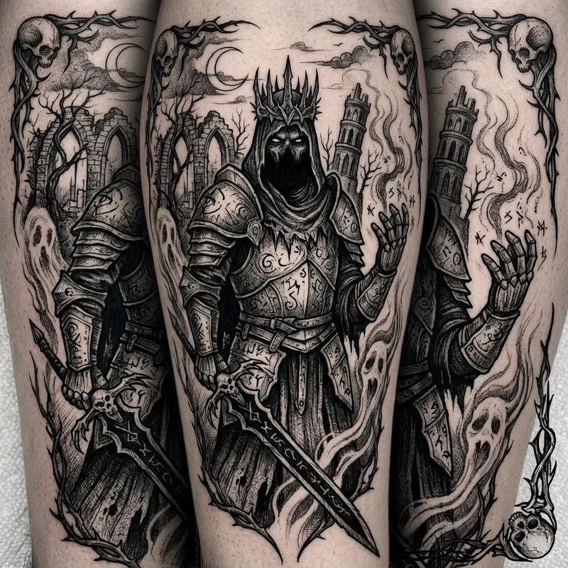Design a tattoo featuring a dark and menacing king from a fantasy realm, with elements of witchcraft and necromancy. He should be adorned in intimidating, ancient armor, carrying a menacing sword, his spectral face barely visible under a crown of iron and a hooded robe. Weathered ruins and eerie ghostly apparitions should serve as the backdrop, encapsulating the chilling and haunting atmosphere of the king's realm.