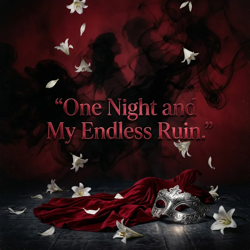 Dark red background with black smoke and falling white lilies. A silver mask lies beside a red dress on the floor, faint silhouettes of two figures fading in the smoke. Elegant, sensual atmosphere. Title in metallic crimson letters: “One Night and My Endless Ruin.”.