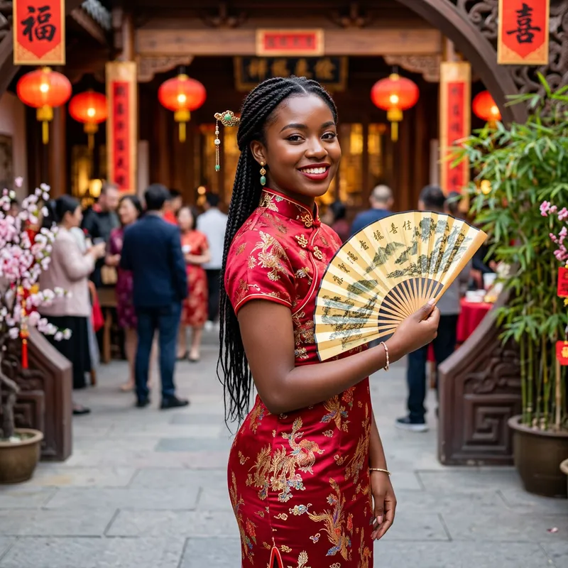 dark skinned American girl dressed in a red silk Chinese dress holding Chinese fan