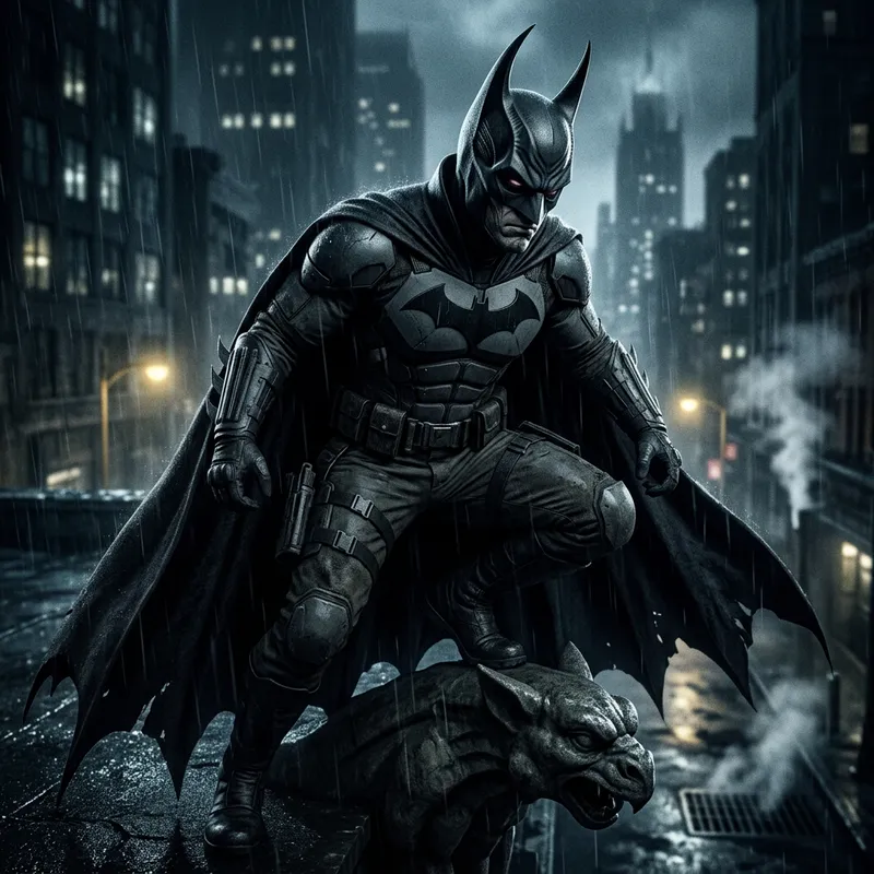 A superhero character with a bat motif, dressed in a dark, noir style costume. The character has cape like a bat's wings and a pointed ear mask. Their logo on chest is a bat silhouette. They are also wearing demon style headgear, adding an eerie sense to their already mysterious look.