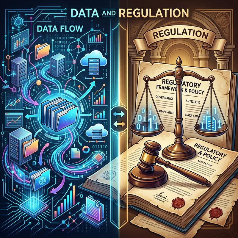 An abstract representation showcasing data and regulation. The image is divided into two halves. The left side presents a collection of symbolic data elements such as servers, files, charts, and binaries. The right side reflects regulation, featuring classical balance scales and a gavel. The scales and gavel can be superimposed on a document indicating policy or regulations.
