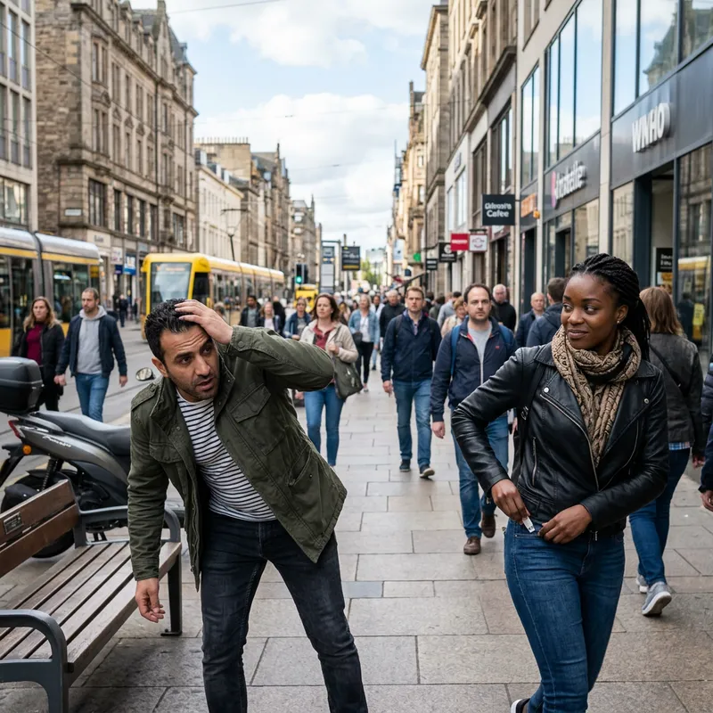 A Middle-Eastern man is frantically searching for a lost data storage USB while a Black woman clandestinely picks it up and tries to run away. She intends to extract the data and information from the USB in order to sell it to a third party. They find themselves in a bustling city center, lined with buildings of different architectural styles. The tension is evident in their expressions, the man's face filled with worry and desperation, while the woman attempts to conceal her glee and excitement.