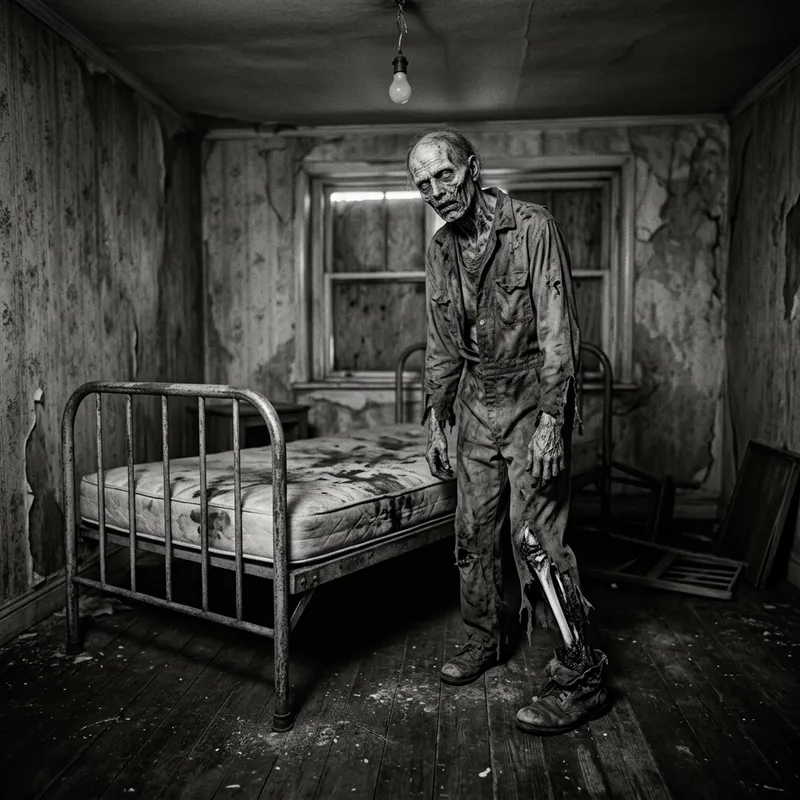 A mostly decayed zombie with a fractured foot, revealing the bone within, stands next to a metallic bed frame supporting a bare, stained mattress. The setting is a somber, grayscale room with wooden flooring. This scene is based in psychological horror aesthetics with an emphasis on evoking a sense of unease and terror.