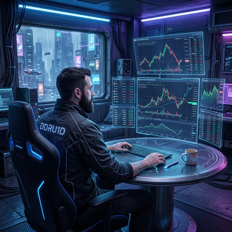 An individual with a beard, possibly in his mid-30s with an athletic build, is seated comfortably on a futuristic chair in front of a circular table. The room emanates a cyberpunk theme, drenched in a blue and purple color scheme. Surrounding him, holographic screens float, each projecting vibrant charts and graphs depicting a multitude of cryptocurrencies fluctuating in the volatile market. On his back, the intriguing and cryptic code 'DDRU1D' is scribed - it might be a pseudonym or a code of an underground organization. Capturing the flow of the digital era, this individual could be deciphering the complexities of the digital currency market.