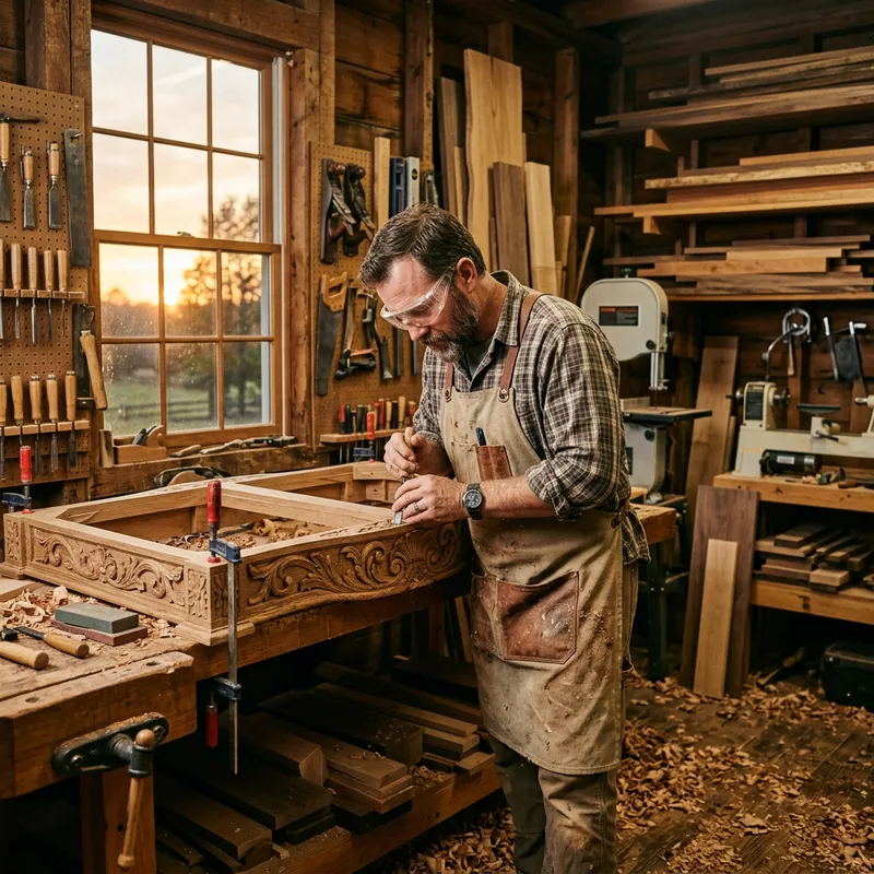 An image of a male Caucasian furniture maker meticulously working on an intricately carved wooden table in his rustic workshop filled with tools and planks of different types of wood. His focus is evident as he carves detailing into the table with care and precision. He's wearing safety goggles and a slightly dust-covered apron over his casual clothing. The setting sun casts a warm glow through the workshop's window, creating a picturesque scene that evokes a sense of dedication and craftsmanship.
