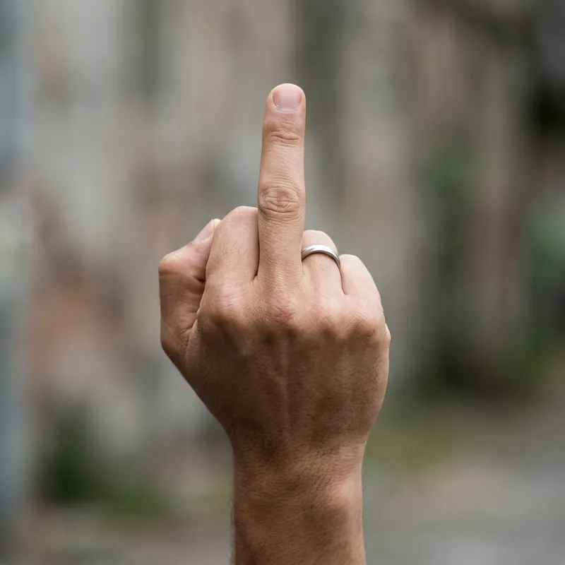 A detailed depiction of a human hand raised in a defiant gesture, specifically the middle finger extending upwards in isolation from the rest of the fingers which are curled into a fist. The background should be of neutral, nondescript quality.