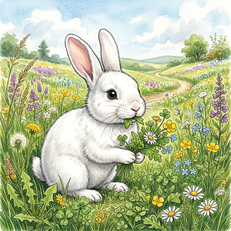 Crisp and detailed depiction of a delightful and animated rabbit, its long ears perked up in alertness. The rabbit's immaculate fur perhaps white in color, soft cotton-like texture visible even in the illustration. Its eyes twinkling with curiosity and liveliness, as it nibbles on a patch of succulent greenery. The background hinting at a serene meadow, teeming with wildflowers and a view of soft blue sky overhead.