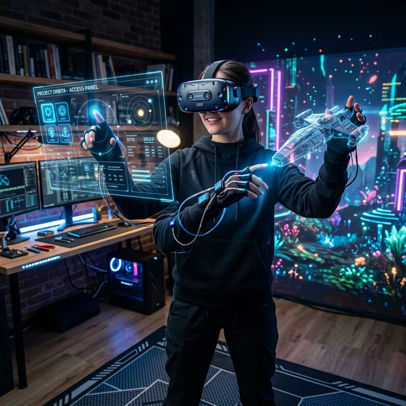 Depict a futuristic scene displaying the technology of virtual reality and mixed reality. Show a user wearing high-tech VR headset and motion tracking gloves, fully immersed in a virtual world filled with vivid and diverse digital elements. At the same time, blend these digital elements with the real-world environment, demonstrating the concept of mixed reality. Include the interaction between the user and the digital elements, such as touching a holographic interface or manipulating a virtual object.
