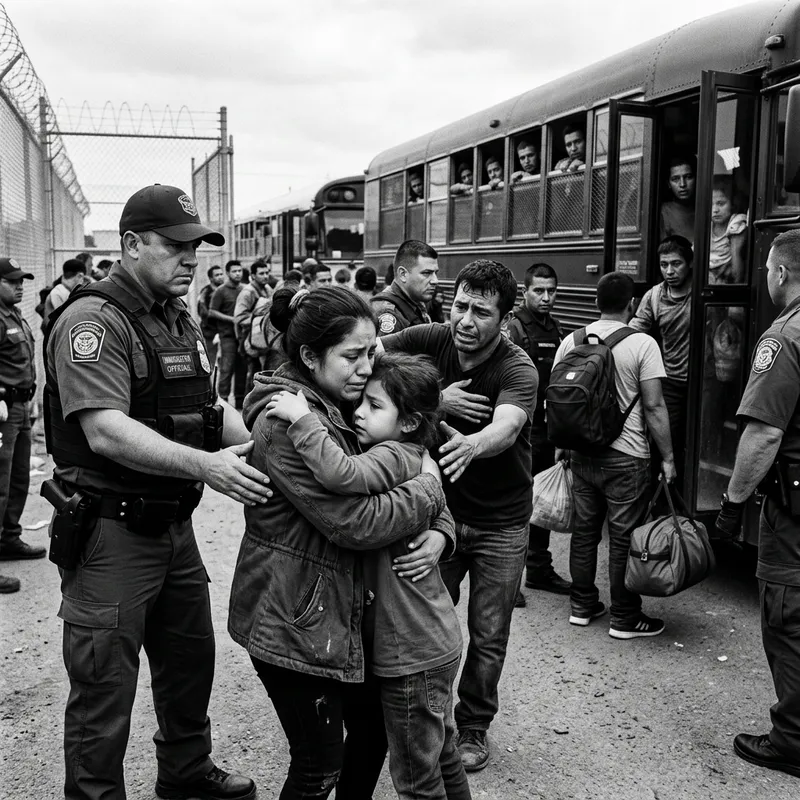 An image capturing the heartrending scenes of deportation, reminiscent of gritty documentary photography. This vivid picture exhibits stern officials, fearful individuals, split families and crowded vehicles. The subjects' expressions of apprehension, longing, and uncertainty are poignantly highlighted. Tint the image in monochrome or desaturated colors to enhance the effect of documentary photography.