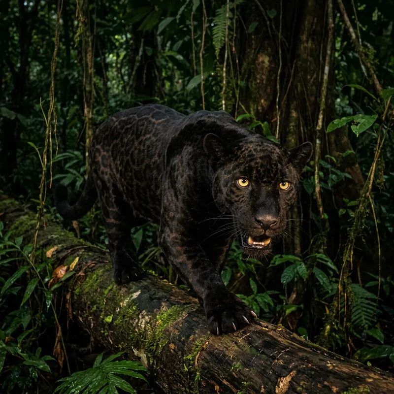 An image of a fierce and highly skilled predator in its natural habitat. It has distinctive yellow eyes that gleam in the darkness, sharp teeth visible when it opens its mouth, and long, retractable claws on its paws. Its body is muscular yet streamlined, built for speed and agility. Its fur pattern provides perfect camouflage in its jungle environment, and it moves with a silent, deadly grace that speaks of countless generations of evolution as a top-tier hunter.