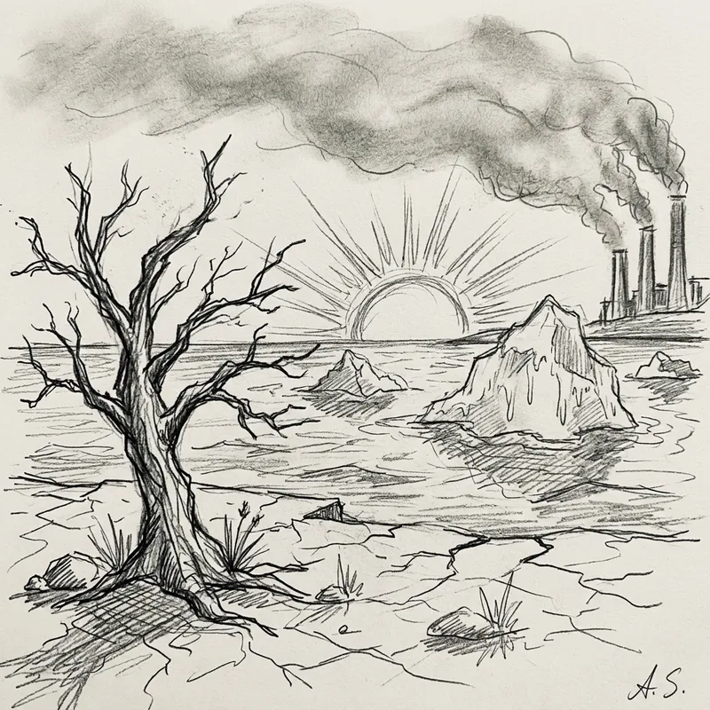 An amateur pencil sketch capturing the heart-wrenching effects of global warming. The scenery should contain melting icebergs in the ocean, under a baking, excessive heat. A tree stands in the foreground, leaf-less and parched, epitomizing the escalating parched condition of Earth. Smoke from distant industries paints the sky grey, hinting at the human contribution to this depressing state. The juxtaposition of these elements should evoke a profound feeling of alarm and sorrow.