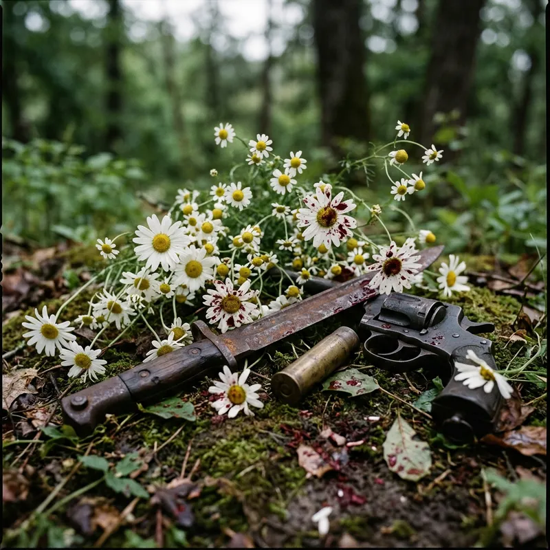 White Flowers Adorned with Bloodstains and Weapons
