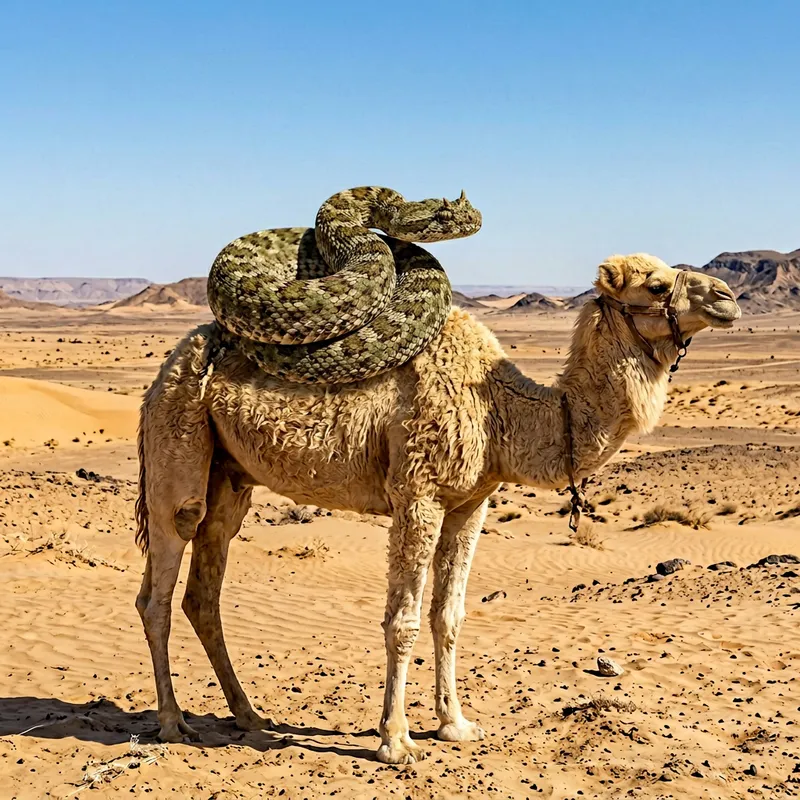 An image depicting a desert scene with a detailed, coiling snake perched on top of a hump-backed camel. The snake environment typically present in the desert, it should be colored in a mixture of greens and browns with fascinating patterns, and the camel, a symbol of endurance and trade routes across arid landscapes, should be light blonde in color with a heavy, shaggy coat. The background is a barren desert landscape with dry plains stretching out to the horizon beneath a bright, unclouded sun. The scene should evoke a sense of nature's incongruity and adaptation.