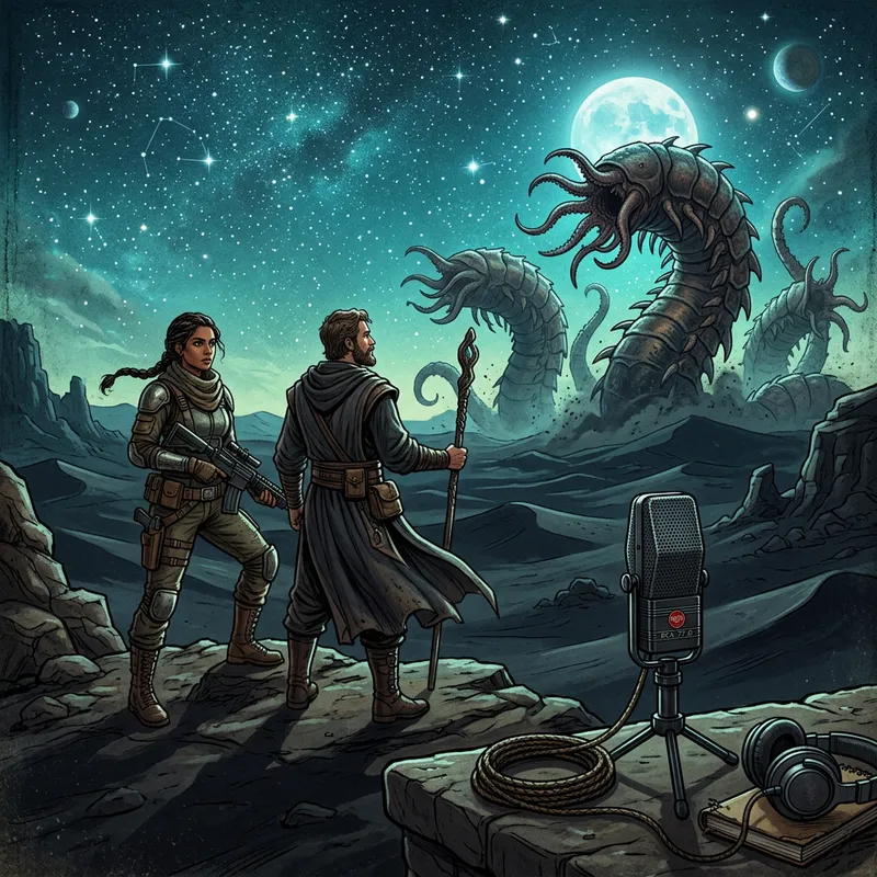 Illustrations for a science fiction podcast, heavily inspired by desert landscapes and chitinous cephalopod-like creatures. It should be reminiscent of the grandeur and mystique from late 19th century futuristic fantasy literature. The layout comprises a dark sandy desert under a turquoise star-studded sky. On the skyline, there are gigantic, worm-like creatures emerging from the sand. Human characters, a South Asian female in combat attire and a Caucasian male in a flowing robe, stand heroically, viewing the majestic scene. In the foreground, a vintage microphone evokes the feel of a podcast.