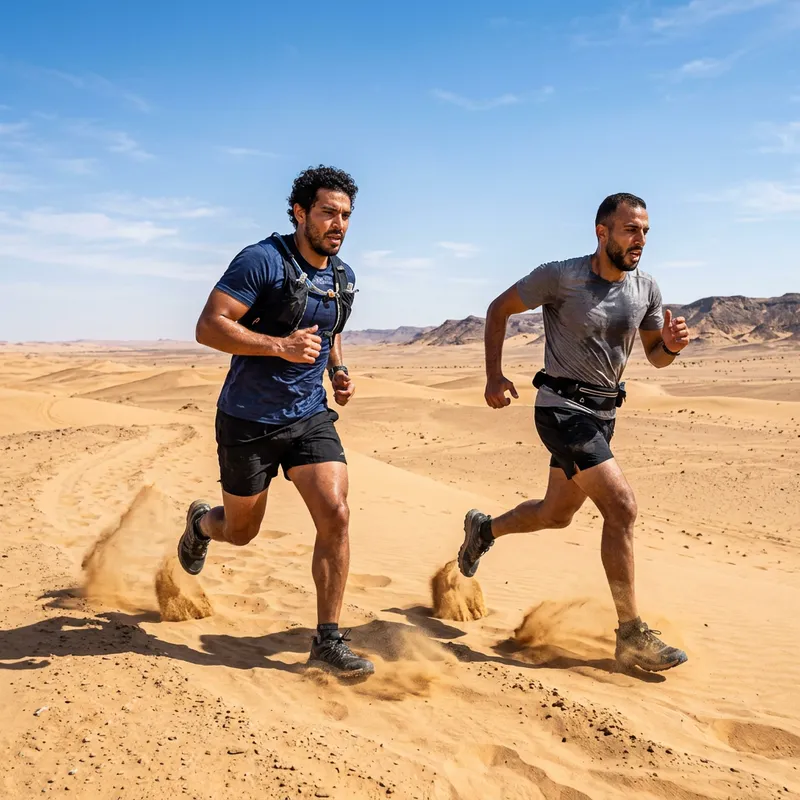 Two men of different descents, one Hispanic and the other Middle-Eastern, are sprinting through vast stretches of a desert. They are kicked up sand as they move swiftly, the barren landscape stretching out in all directions. Their clothes are drenched in sweat, indicating the extreme heat of the blazing sun overhead.
