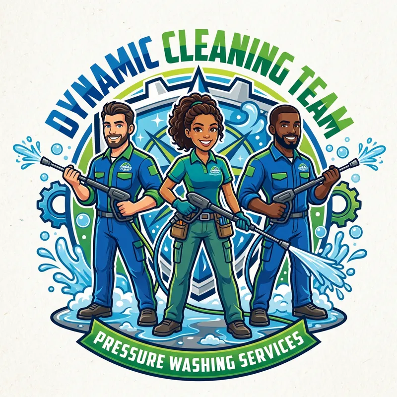 Design a dynamic and fun 2D mascot logo featuring two men holding pressure washers, standing confidently. One man has light skin, and the other has dark skin, both wearing casual work uniforms with vibrant colors (blue and green). Between them, place a woman, also holding a pressure washer, with a friendly and energetic expression. She can have medium skin tone, wearing a matching uniform, slightly different in style. Make the overall composition balanced, with a professional yet approachable feel, representing teamwork and efficiency.