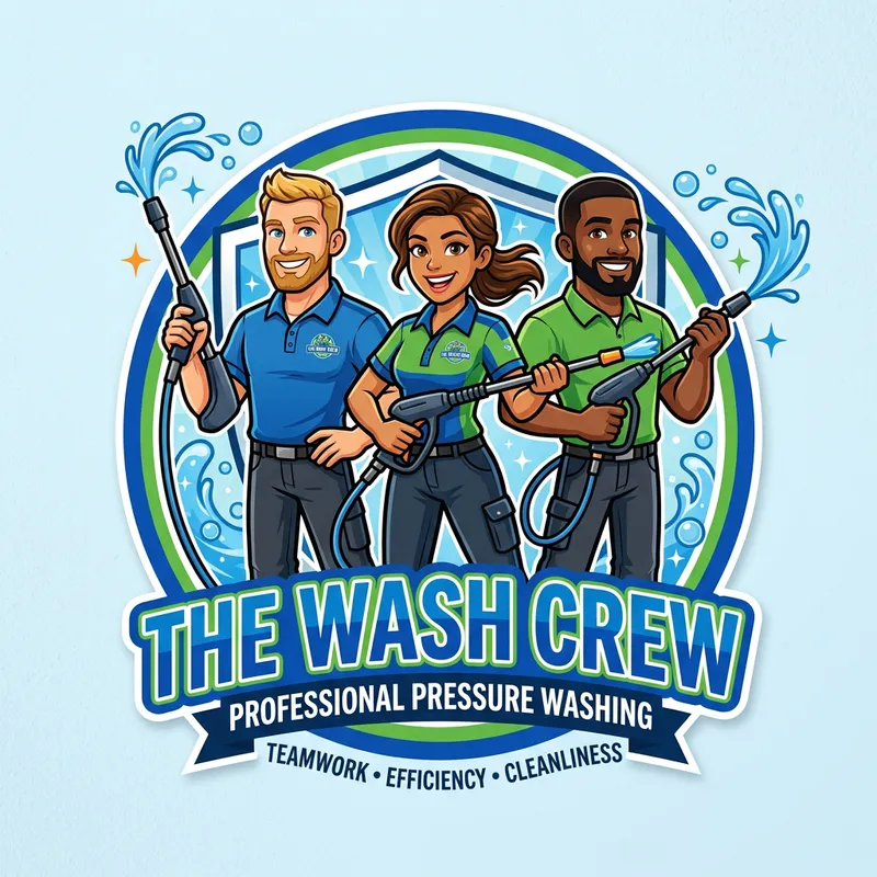 Design a dynamic and fun 2D mascot logo featuring two men holding pressure washers, standing confidently. One man has light skin, and the other has dark skin, both wearing casual work uniforms with vibrant colors (blue and green). Between them, place a woman, also holding a pressure washer, with a friendly and energetic expression. She can have medium skin tone, wearing a matching uniform, slightly different in style. Make the overall composition balanced, with a professional yet approachable feel, representing teamwork and efficiency.