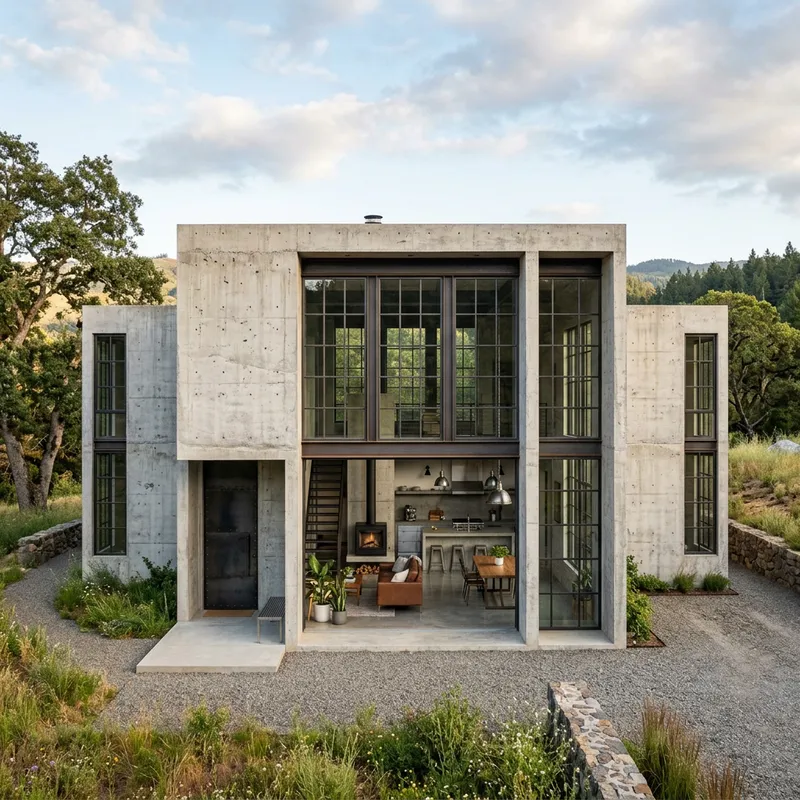 Design a residential home with an industrial loft style, featuring an exterior made entirely of raw concrete for a bold and minimalist look. The layout places an open-plan kitchen and living room at the center, flanked by bedrooms on either side. Long, narrow factory-style steel windows are strategically positioned to provide ample natural light and ventilation while maintaining privacy. The design stays true to the raw, industrial, and minimalist theme, emphasizing clean lines and functional elegance.