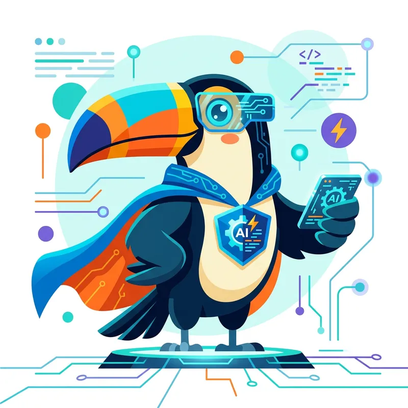 Design a toucan mascot with a super hero cape in a flat design style, with bright colors and clean lines, that recalls the modern and minimalist aesthetic of the Swift Heroes and Flutter Heroes events. The toucan should have a friendly and professional appearance, with elements that recall technological innovation and artificial intelligence. Include details like futuristic glasses or tech accessories to emphasize the AI theme.