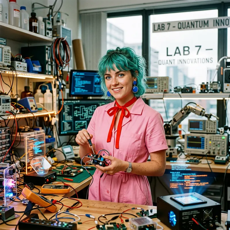 Generate an image of a woman with teal colored hair, wearing a pink dress and red ribbon around her neck. She is wearing big round blue earrings. She is a scientist and is surrounded by various technological gadgets and gizmos. Her eyes are sharp and blue, and she's surrounded by an adventurous aura.