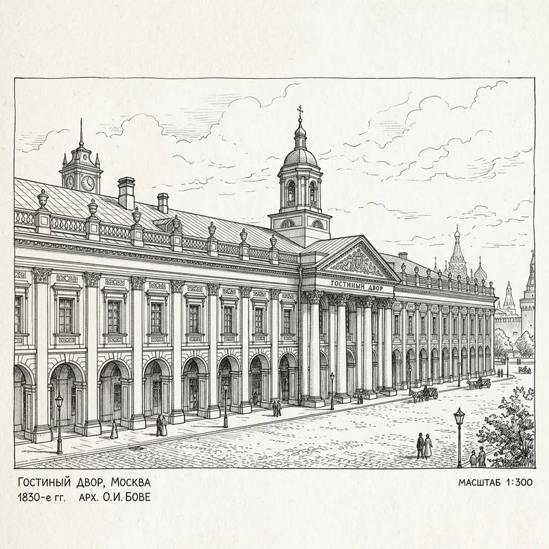 Create a detailed architectural sketch of the Gostiny Dvor building in Moscow using thin lines. The building should be represented accurately, revealing its classical Russian architectural elements and structure. Please, represent the grandiose facade, multiple archways and symmetrical windows, the intricately designed cornices and roof balustrades.