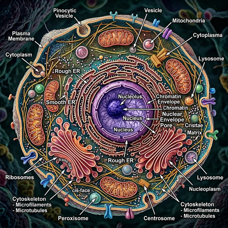 Generate an image of a detailed biological cell showing various components such as the nucleus, mitochondria, ribosomes, endoplasmic reticulum, Golgi apparatus, and cytoplasm. The cell should be depicted as highly complex and intricate.