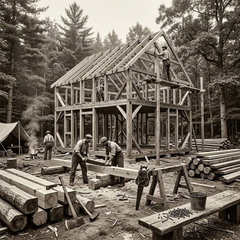 A highly detailed, black and white image depicting a scene from the past in the middle of a forest. At the center of the image, a two-story wooden house is under construction, with the skeletal framework being clearly visible. Around and within the construction site, various vintage tools such as a saw, hammer, and nails are scattered about, demonstrating the ongoing work. Nearby, piles of wooden logs await their turn to be fitted into the burgeoning structure. The surrounding wilderness lends an air of tranquillity to the busy construction scene, intertwining nature and human endeavor.
