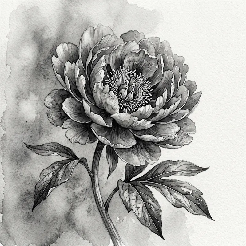 Create a detailed, black and white image of a flower using a watercolor effect. The image should capture the delicate form and intricate details of the flower, showcasing the interplay of light and shadow in monochrome. The flower's petals, stem, and leaves should be visibly textured, with the watercolor technique enhancing their natural beauty.