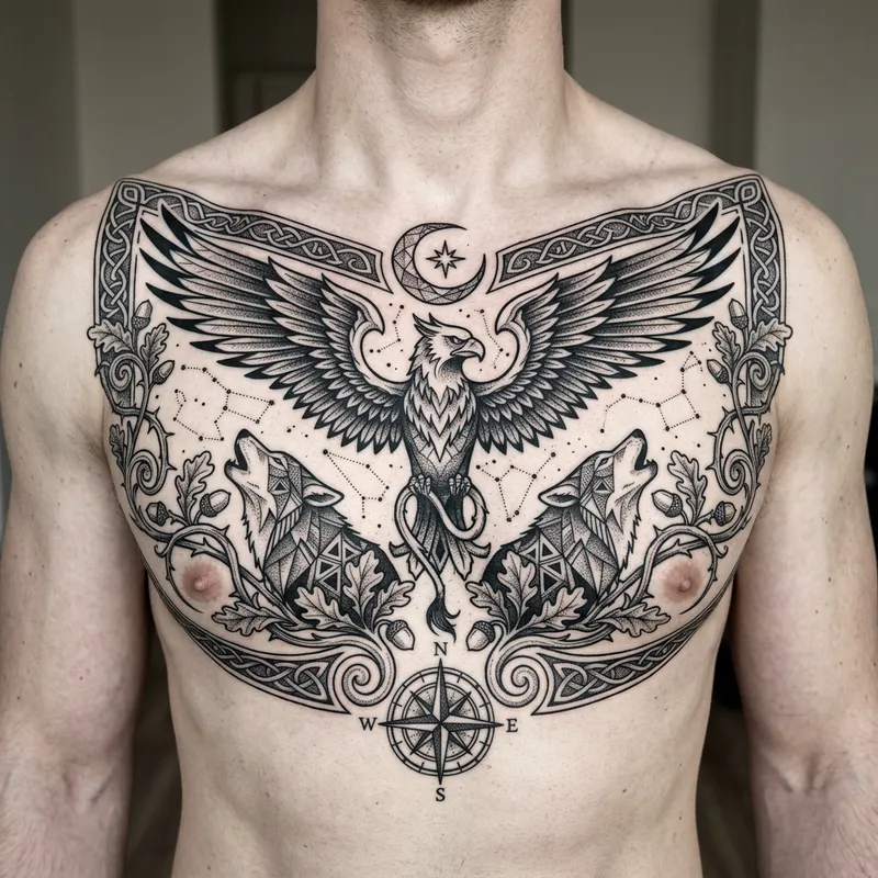 Detailed and intricate ink drawing projected as a full chest tattoo, in the style of vector art. The design consists of a complex pattern that covers the entire pectoral area. Imagine the design to be rich with elements from nature and mythology, perhaps including animals, and cosmic elements. It should be devoid of color, embodying the stark beauty of black ink against the skin, which is the essence of traditional tattoo art.
