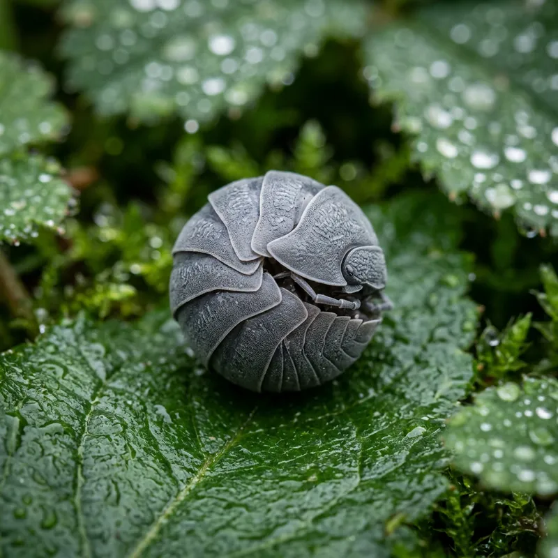 A close-up image of a roly-poly bug, also known as a pill bug or doodlebug. It is grey in color with detailed textured layers on its round body. The tiny appendages, antennas, and legs are neatly folded under its body, creating a perfect spherical shape. The bug is situated on a leafy green background with dew drops, creating a nice contrast. Optional: soft spotlight on the bug, but not too bright, maintaining the natural setting.