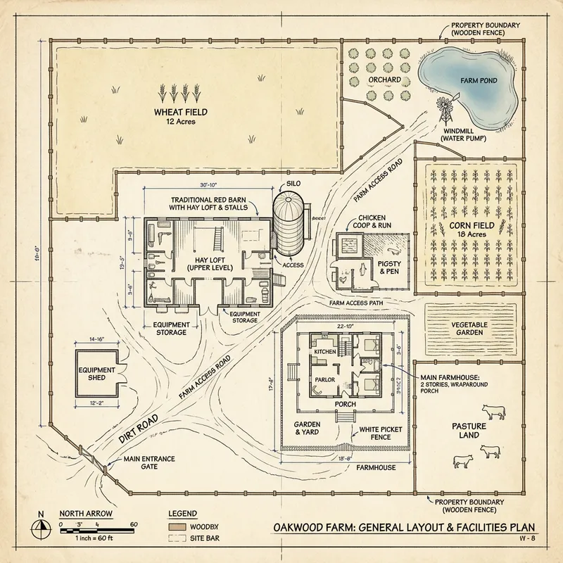 A detailed farm floor plan. The plan includes a large, red traditional barn with a hay loft and attached silo. Adjacent to the barn is a farmhouse with a wraparound porch and white picket fence. Nearby, there's a chicken coop and pigsty. The farm is outlined by wooden fences that separate various sections for different crops, including wheat and corn. A winding dirt road connects all these buildings, with a small pond and a windmill on the edge of the property. Small annotations label the different areas and structures for a better understanding of the layout.