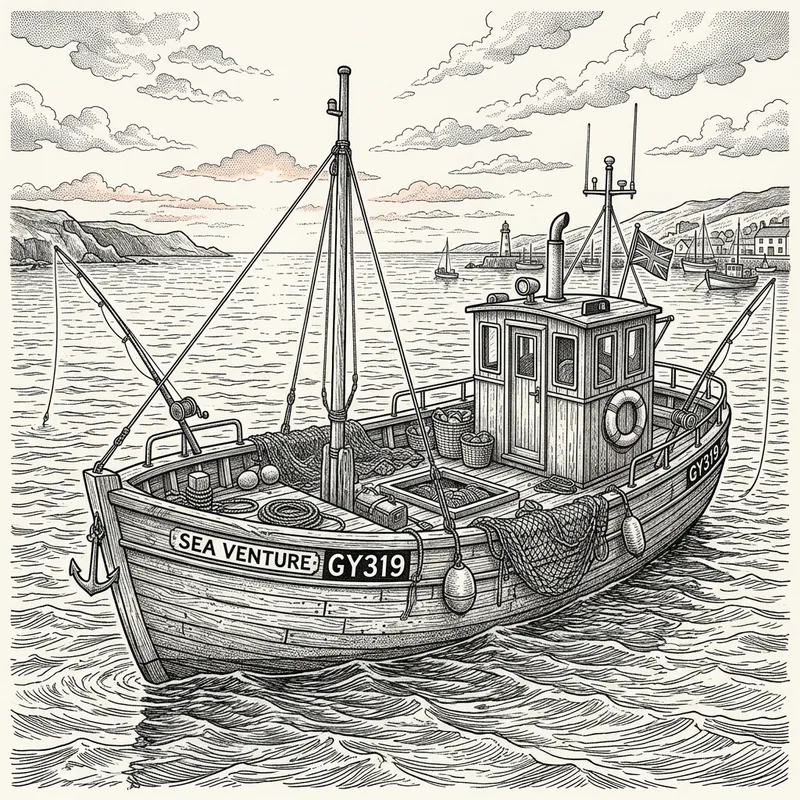 A detailed depiction of a fishing boat awaiting coloring. The boat has a sturdy structure with wooden panels lining its exterior. It features a compact cabin towards the aft, two robust fishing rods mounted on either side, and strewn nets ready for the day's catch. The sea reflects the early morning sun, creating an intricate pattern on the gentle waves. The sky, still tinged with dawn hues, has scattered clouds, suggesting an impending weather shift. Please maintain the image monochrome to allow for further coloring.