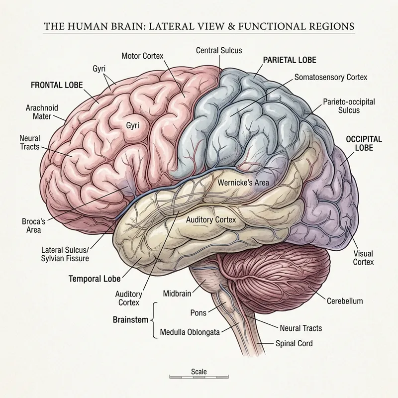 A detailed, scientifically accurate illustration of a human brain. It should be depicted from a lateral view, showing all the different sections like frontal lobe, parietal lobe, occipital lobe, cerebellum, and brainstem. The contours should be rendered with soft shades of grey and pink, giving the impression of a realistic, organic structure. Delicate lines should indicate the intricate networks of neurons and blood vessels. No human figures needed.