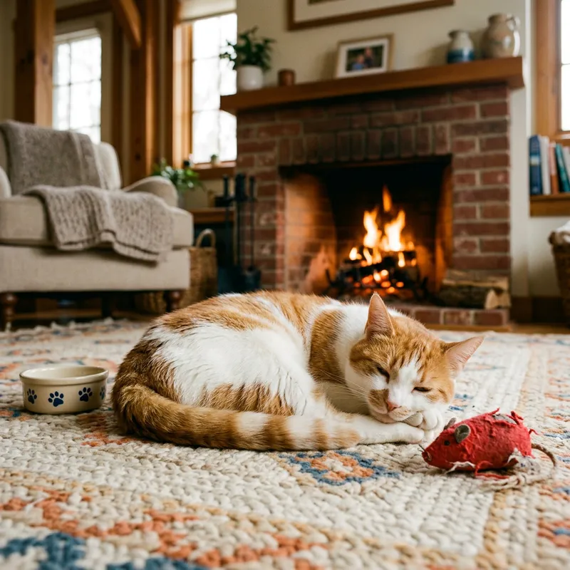 Create a detailed image of a house cat lounging lazily. It should have glossy, short fur coat with patches of white and orange. It's tail should be curled up around its body. The cat should be placed against a backdrop of a cozy living room, with a soft rug and a warm fireplace. On the floor next to the cat, there is a small, empty food bowl, and a red, tattered mouse toy which the cat seems to have been playing with.