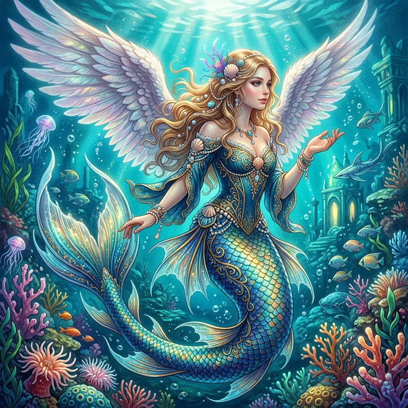 Detailed Mermaid Drawing: Angel Wings and Enigmatic Beauty