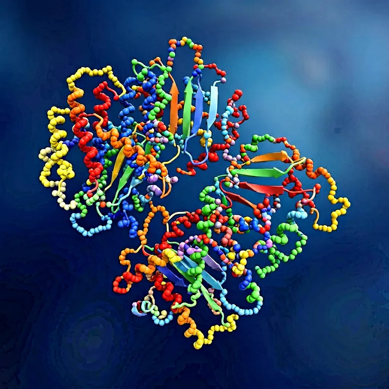 A detailed microscopic view of a protein molecule showcasing its complex three-dimensional structure. The protein structure is composed of amino acids lined in a specific sequence. The image depicts these amino acids in various colors to distinguish different types. The entire model is set against a blue gradient backdrop to represent the microscopic environment.