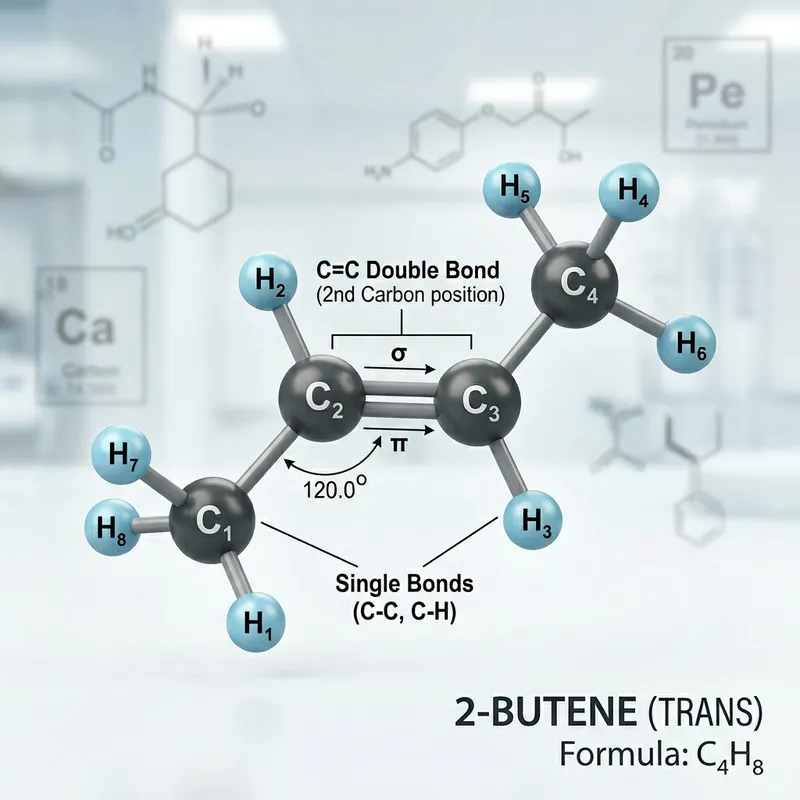 Create a detailed image of the molecular structure of 2-butene, a simple alkene. Illustrate the carbon atoms arranged in a chain, with two carbon atoms connected by a double bond. Also, depict the hydrogen atoms attached to the carbon atoms.