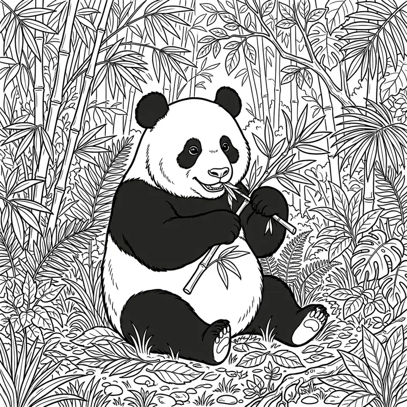 Create a detailed coloring page featuring a cute panda. The panda is sitting comfortably on the forest floor, munching on its favourite bamboo shoots. Its round, plump body is unmistakable, with its signature black patches around the eyes, ears, and body. The rest of its body is colourless, perfect for children to fill in with their favourite hues. The background features an array leaves, typical of a serene and lush forest, with the outlines varying in shapes, sizes and complexities to invite creativity and offer a range of coloring challenges.