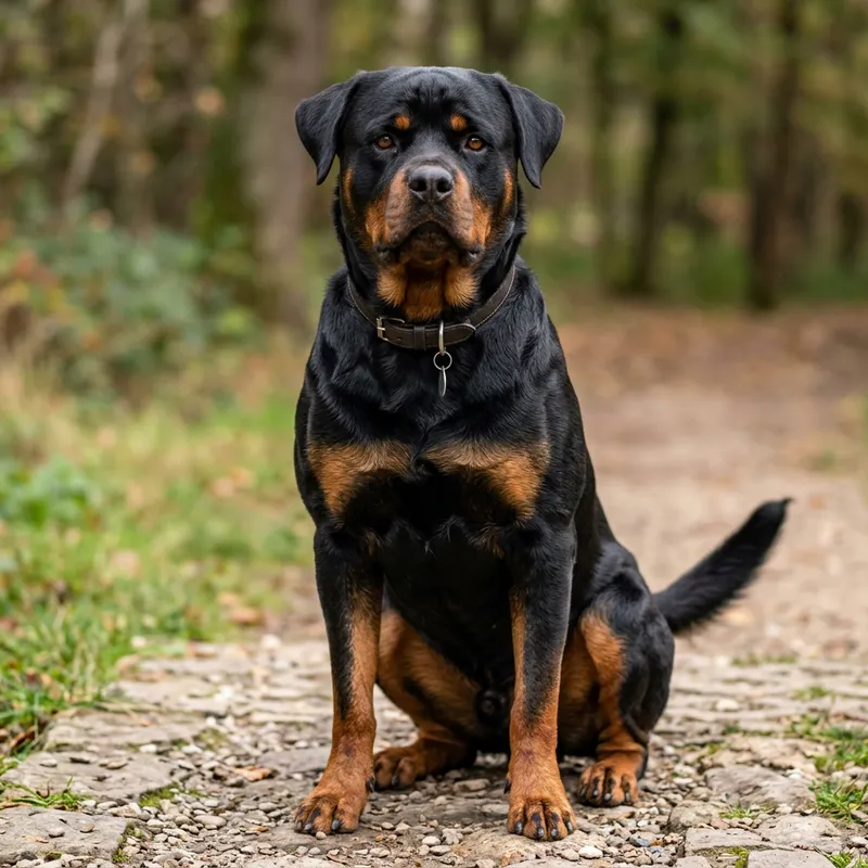 A detailed image of a rottweiler, showcasing its distinctive black coat with rich tan markings. The dog is looking directly into the camera with keen, intelligent eyes. It has a strong muscular body, demonstrating its breed's known strength and endurance. Its small drooping ears and broad chest are prominent, and there's a wagging tail in the background. The background is a simple, nondescript setting so as not to distract from the main focus, which is the rottweiler.
