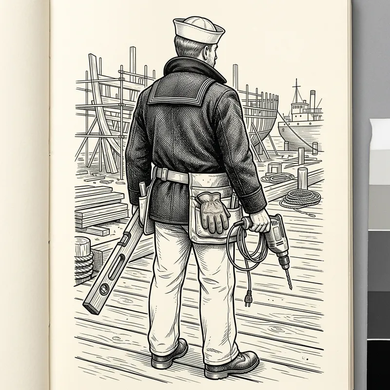 A detailed black and white line art depicting a sailor seen from the back, wearing a sailor's headgear. In his possession, he has some construction tools, including a power drill and a level.
