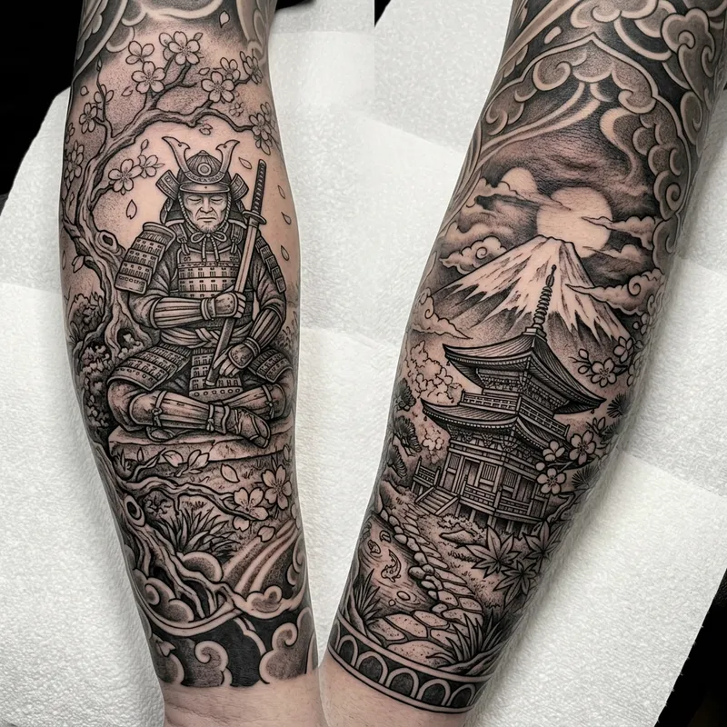 Design a detailed and expressive lower arm half sleeve tattoo. Incorporate two main elements. First, depict a Samurai, sitting peacefully under a cherry blossom tree with his katana in hand. Dress the Samurai in traditional Japanese armor and position him in a calm posture, symbolizing his inner strength and wisdom. Second, depict an elegant Japanese temple against a picturesque backdrop of Mount Fuji. Showcase the traditional architectural features of the temple, surrounded by cherry blossoms and other typically Japanese plants. The combination of these elements should represent serenity and spirituality.