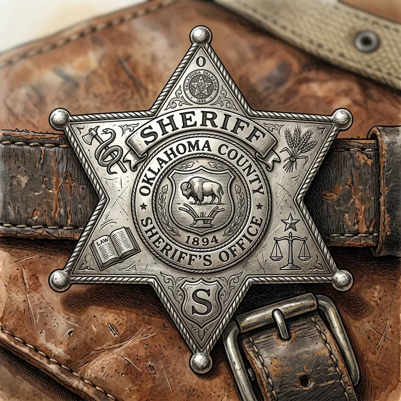 A detailed illustration of a traditional sheriff's badge, also known as a sheriff's star. It is carefully carved of polished metal, perhaps silver or gold. Its surface gleams brightly in the light, beautifully reflecting its surroundings. The badge features six points and is accented with intricate engravings that chisel the surface, giving depth and texture. Each point of the star could potentially bear an important symbol or an initial, relating to the duties and responsibilities of a sheriff. The badge has a smooth feel, worn from years of use, showing signs of a storied history and important role.