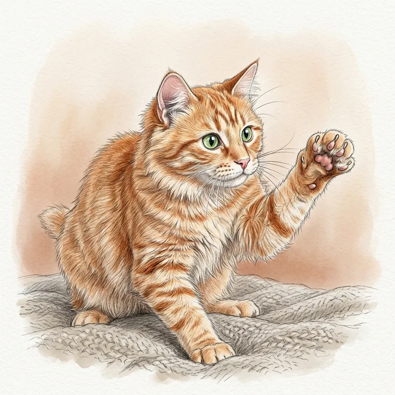 Sketch a detailed image of a domestic cat. The cat should be of a ginger color with bright green eyes and soft, fluffy fur. It should be in a playful position with its right paw slightly raised as if ready to pounce on an unseen toy. The background should be simple and not overly detailed, maybe just a solid color or a very soft gradient.