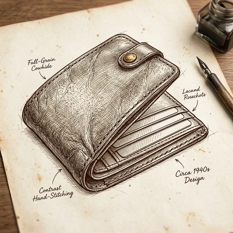 A finely detailed sketch of a men's leather wallet. The image should capture the vintage essence using sepia tones and exhibit complex line work to expertly depict the folds and texture of the leather. This image should be reminiscent of a classical men's accessory. It should be created similar to using a fine pen and ink drawing technique.