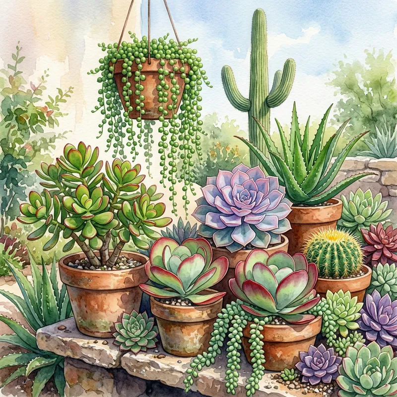 A detailed watercolor painting of a variety of succulent plants. There are multiples types of succulents, ranging from jade plants with their chubby, glossy leaves to string-of-pearls with its numerous spherical leaves hanging like a vine. There are also some cacti, including the columnar saguaro, its height accentuated with arms curving upward. Other succulents include the aloe with its spiky, aloe-vera type leaves, and an echeveria with its flared rosette form. Paddle plant succulents are present too, with their broad flat leaves. The succulents are in a variety of colors, from light green to deep green, with some having hints of purple or red.