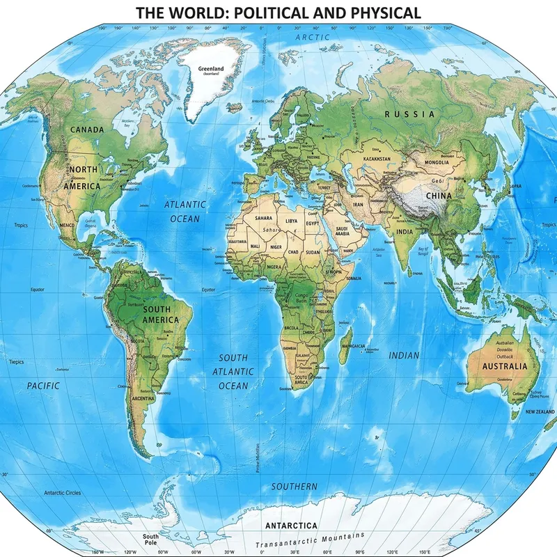 Detailed World Map with Continents, Cities & Landmarks