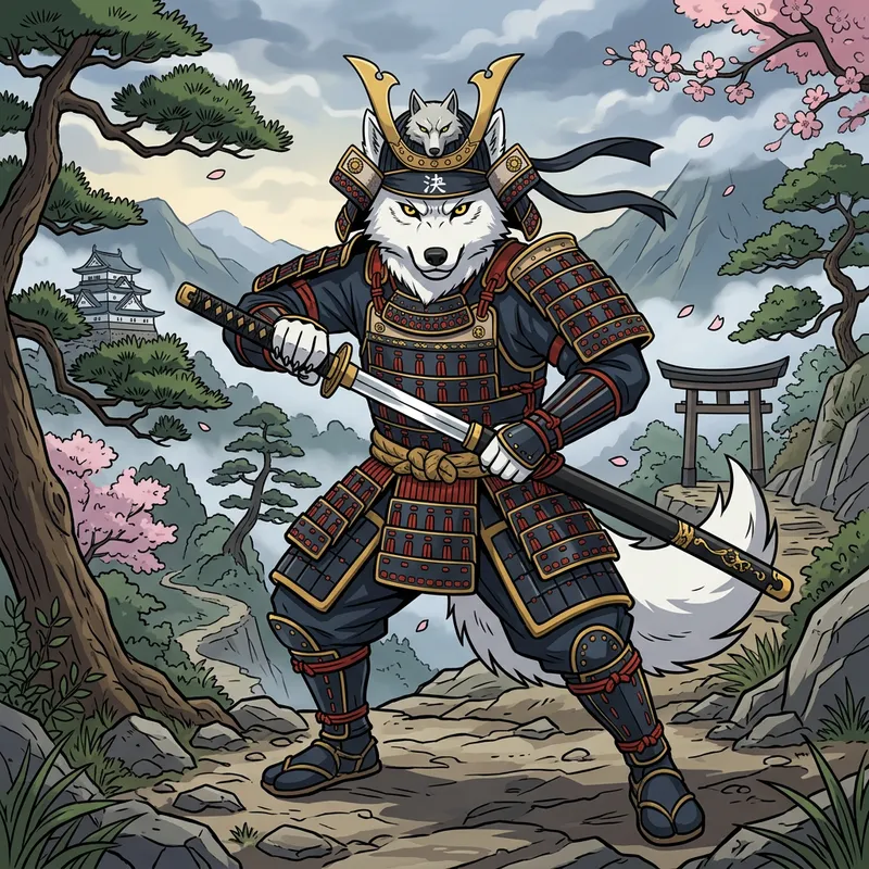 Create an image of a cute white humanoid wolf clad in traditional samurai armor. This samurai wolf has a determination in its eyes that is unmistakable, ready for the next battle. It confidently grips a katana with both hands, displaying its readiness to charge into a fray. The image should use a cel shading technique, adding a layer of simplicity and clarity that would typically be seen in animation.